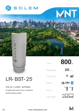 * Menzil 800 m İlişkili Modüller 25 'e kadar LR-BST-25 Güç Kaynağı Bağlantı THE 3G / LORA TM GATEWAY POLE WALL (10 adede kadar sulama, havuz ve aydınlatma Montaj SOLEM modülünü yönetin) Yönetim Şekli 10 www.mntsulama.com
